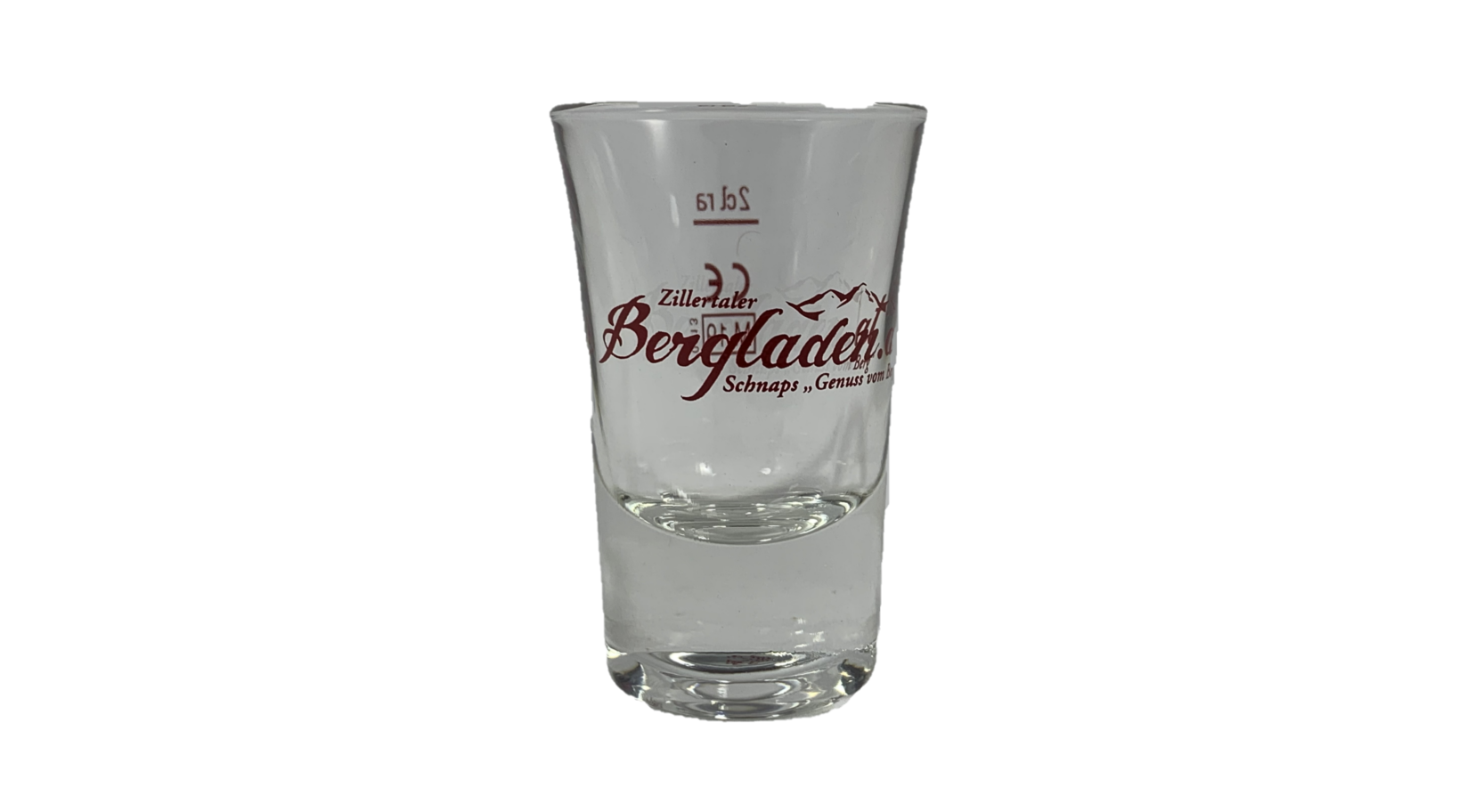 Starker Begleiter mit Bergladen Logo und Eich-Maß 2cl.
